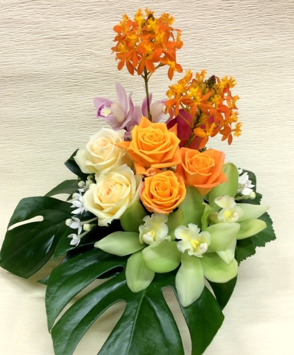☆オレンジ系の薔薇・洋ランなどのオレンジ・イエロー・グリーン系の花を中心に仕上げたアレンジメントです。